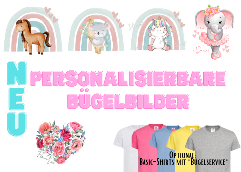 Eigenproduktion personalisierbare Bügelbilder & Shirts mit Bügelservice