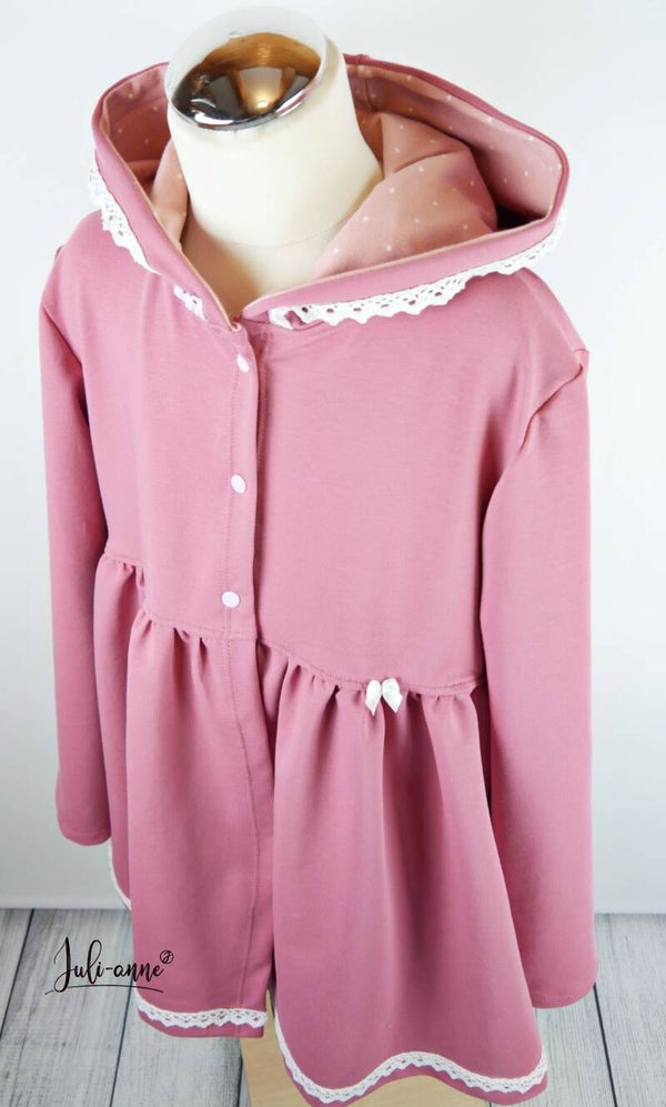 Nur die Kapuze ist gefüttert, die Jacke ist einlagig genäht. Sie wird mit Druckknöpfen verschlossen.