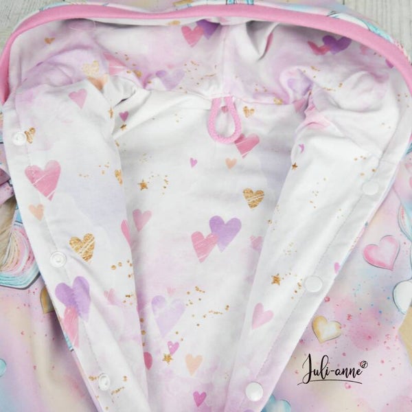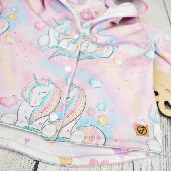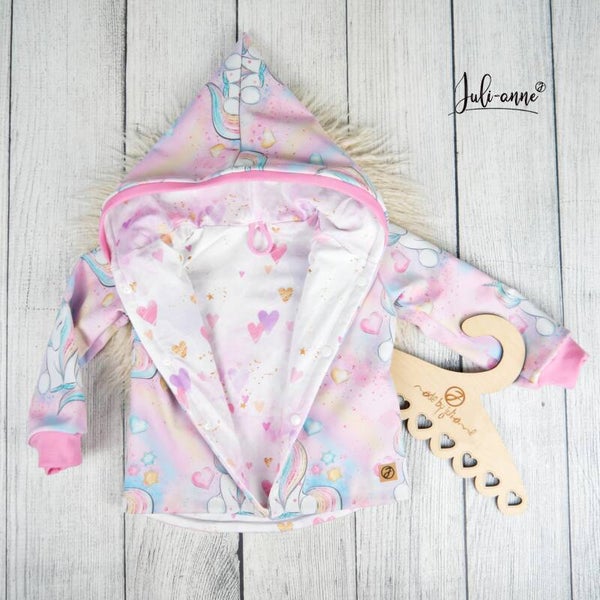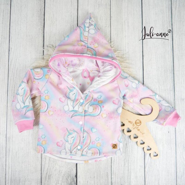 Die Jacke ist mit Druckknöpfen oder einem Reißverschluss mit einen Kinnschutz und zusätzlich einen kleinen Zipper-Band, damit er auch von den Kids leichter auf und zu gemacht werden kann, bestellt werden.