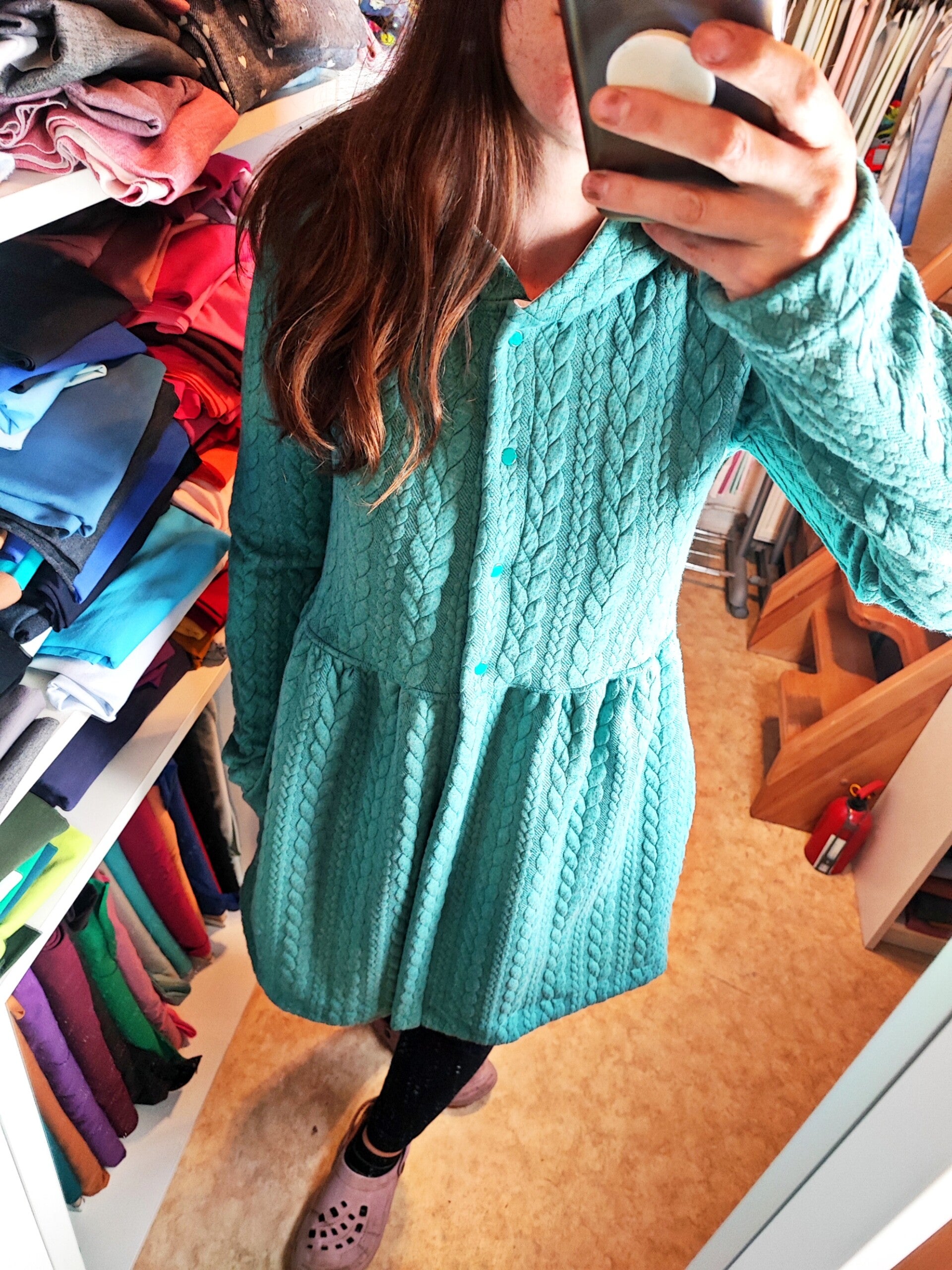 Er ist einlagig, nur die Kapuze. Damit ist der Mantel eine leichte Strickjacke zum Drüberziehen, wenn es etwas frischer wird.