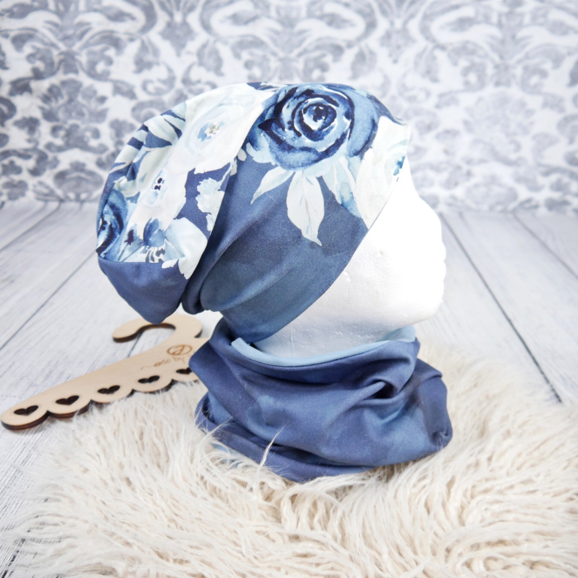 KU 53-54 Set: Beanie & Schlupfschal Rosen Bordüre Rauchblau#Übergang