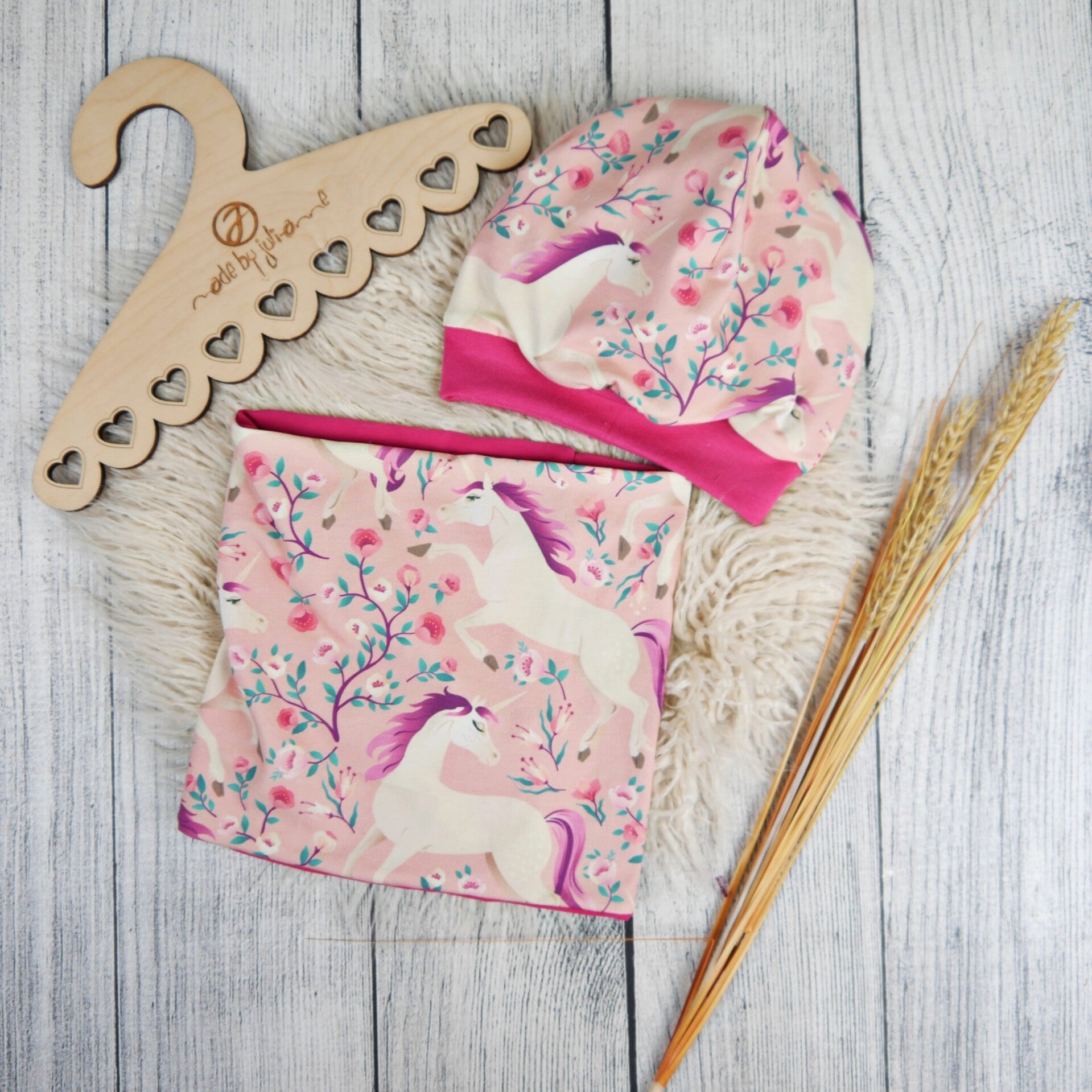 KU 52/53 Set: Beanie & Schlupfschal Einhörner Rosa Pink