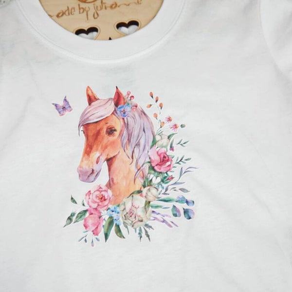 Weißes Shirt mit meiner EIGENPRODUKTION Bügelbild Blumen Pferd