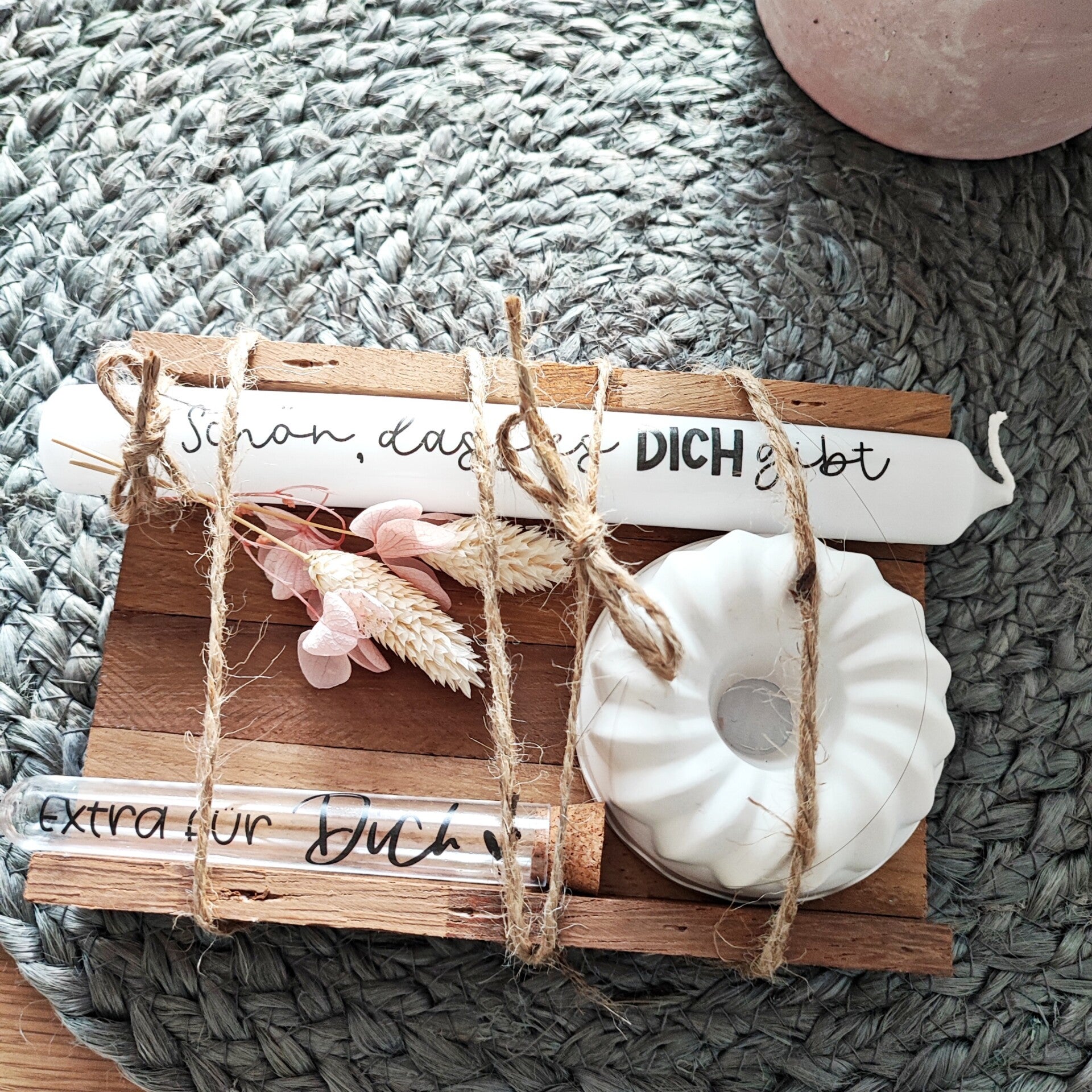 Geschenksets bestehend aus einem Kugelhupf, gegossen aus Keraflott, einer Kerze mit Glückwünschen und einem Reagenzglas, dass zum Beispiel mit Geld, Gutscheinen oder persönlichen Glückwünschen befüllt werden können. Die hölzerne Geschenkverpackung kann einfach umgedreht und als Tablett für die Kerze genutzt werden.