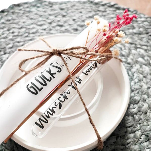 Geschenksets bestehend aus einem Kerzenteller, gegossen aus Keraflott, einer Kerze mit Glückwünschen und einem Reagenzglas, dass zum Beispiel mit Geld, Gutscheinen oder persönlichen Glückwünschen befüllt werden können.