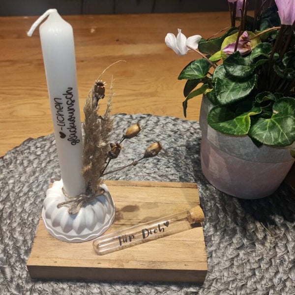 Geschenksets bestehend aus einem Kugelhupf, gegossen aus Keraflott, einer Kerze mit Glückwünschen und einem Reagenzglas, dass zum Beispiel mit Geld, Gutscheinen oder persönlichen Glückwünschen befüllt werden können. Die hölzerne Geschenkverpackung kann einfach umgedreht und als Tablett für die Kerze genutzt werden.