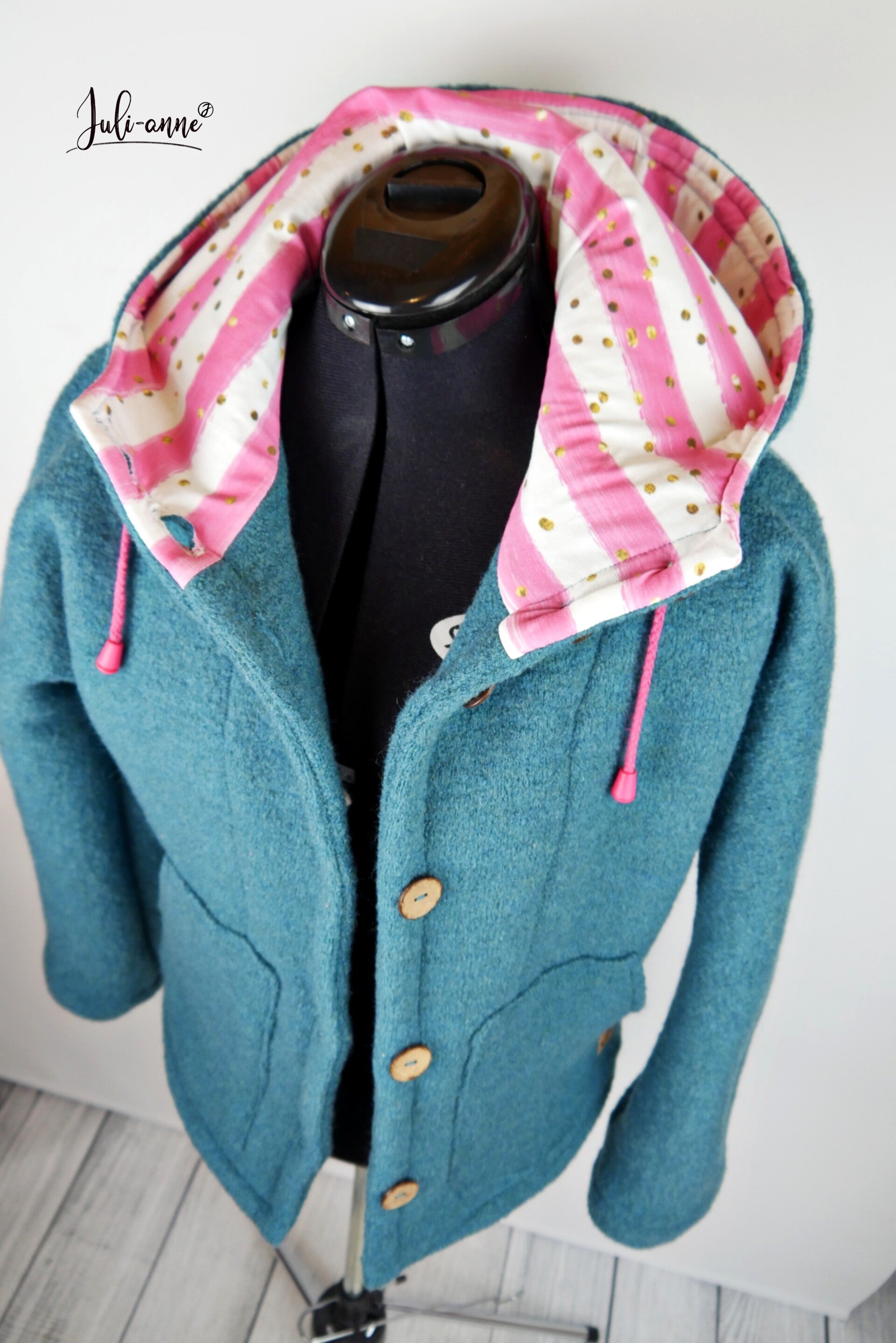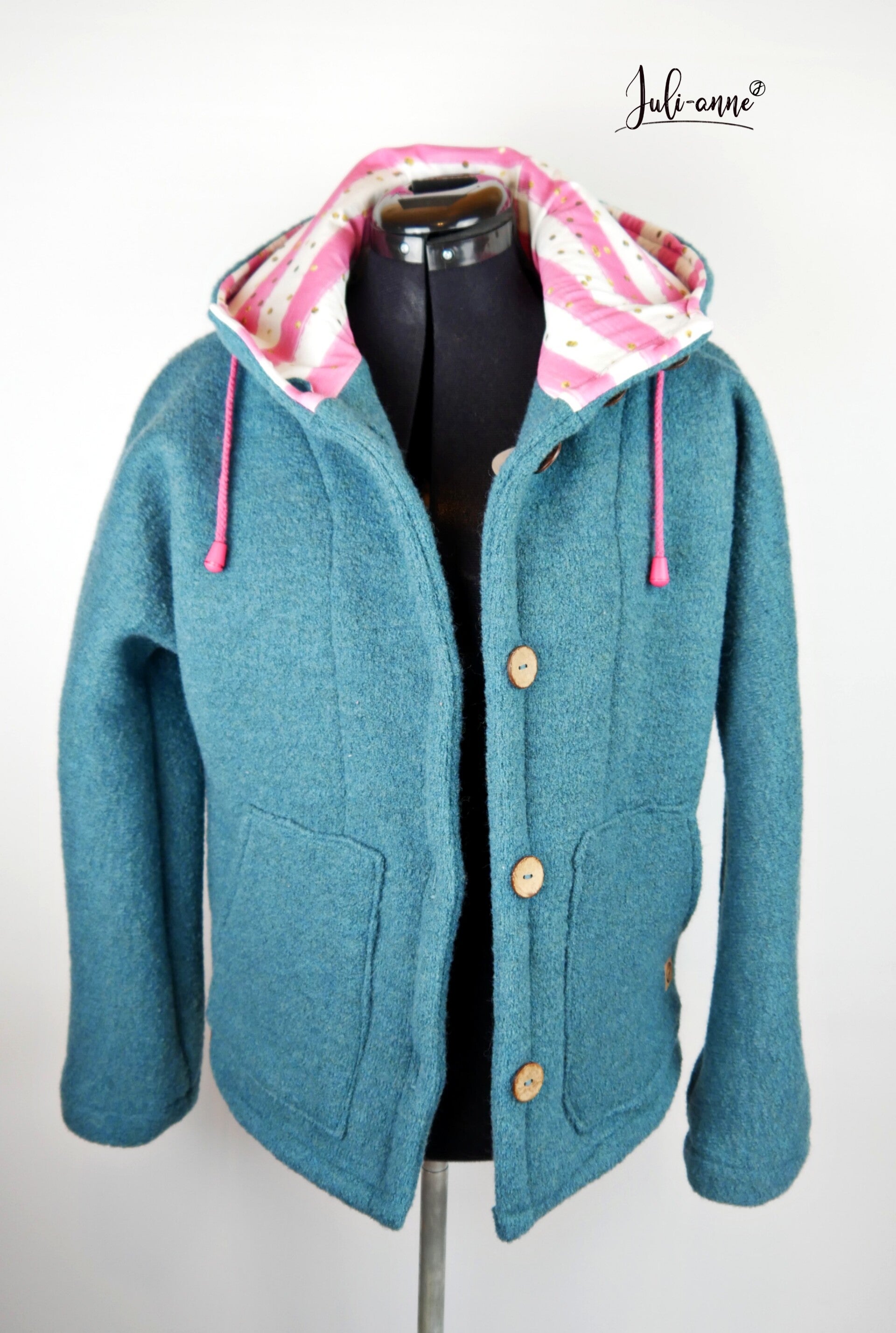 Die Ärmel sind überschnitten, dass heißt, sie sind direkt mit dem Vorteil verbunden und bestehen aus einem Stoffstück. Die Jacke ist einlagig. Nur die Kapuze ist mit einem Jersey gefüttert und die Knopfleiste hat einen Beleg aus Walk.