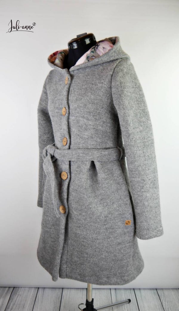 Der Mantel ist einlagig genäht, nur die Kapuze ist mit Jersey gefüttert. Das erleichtert die Pflege und erhält die natürlichen Eigenschaften von Wollwalk.
