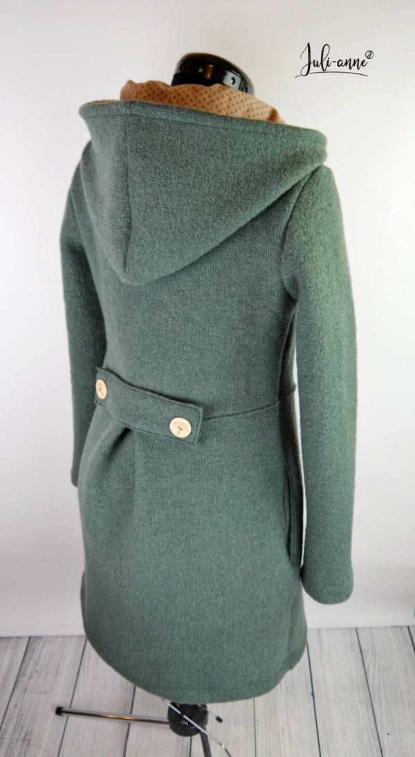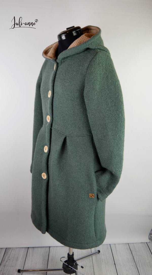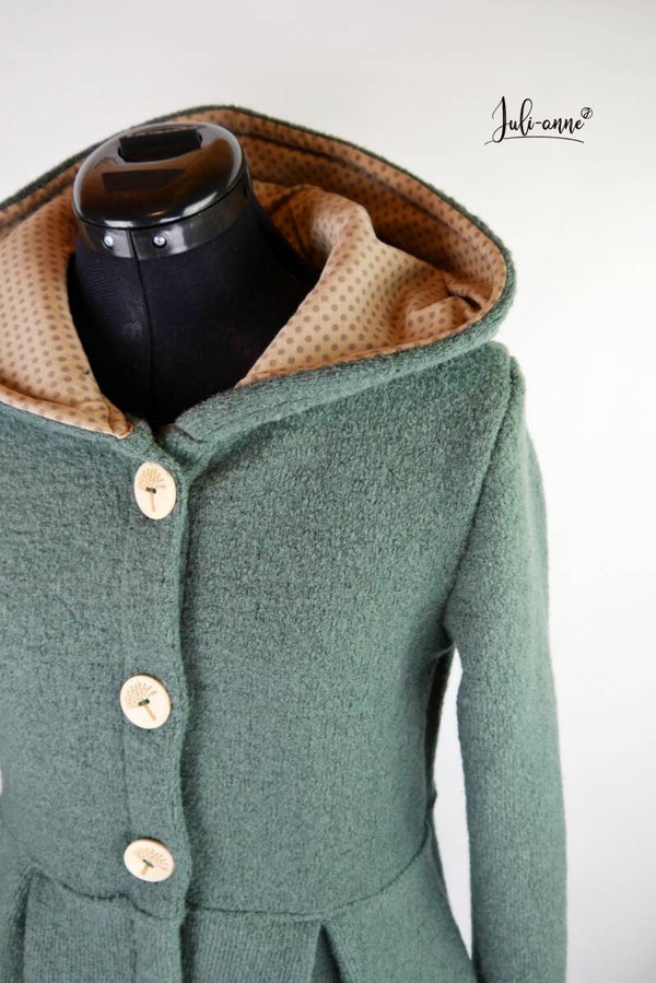 Der Mantel ist einlagig genäht, nur die Kapuze ist mit Jersey gefüttert. Das erleichtert die Pflege und erhält die natürlichen Eigenschaften von Wollwalk.