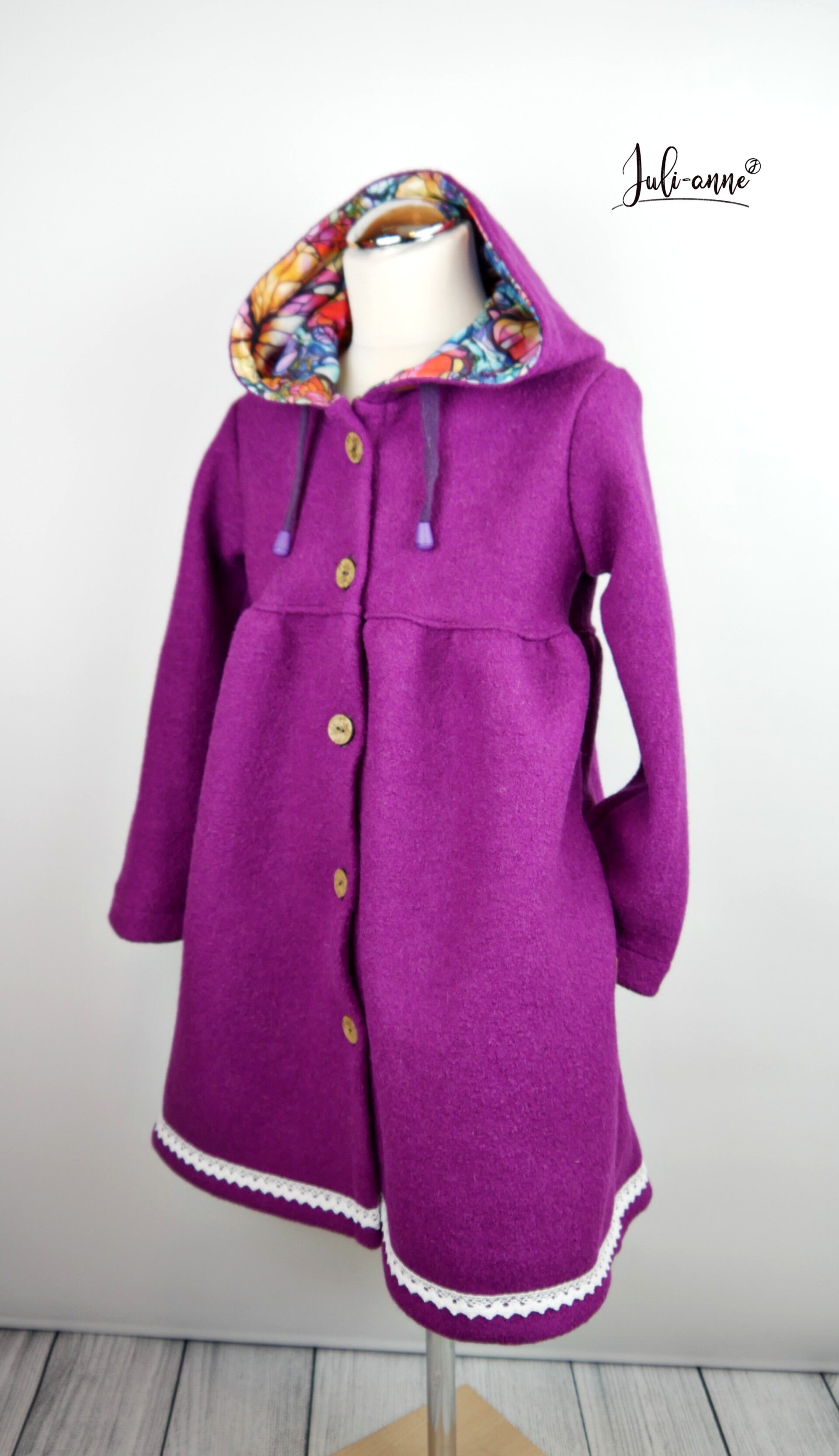 Jumi ist ein süßes Jäckchen, dass ich hier aus Walk fertige. Die Jacke ist einlagig, nur die Kapuze ist gefüttert. Das ist besonders bei der Reinigung praktisch. Ein komplettes Futter aus Jersey ist nicht extra wärmend und außschließlich dekorativ, benötigt jedoch eher mal eine Reinigung.