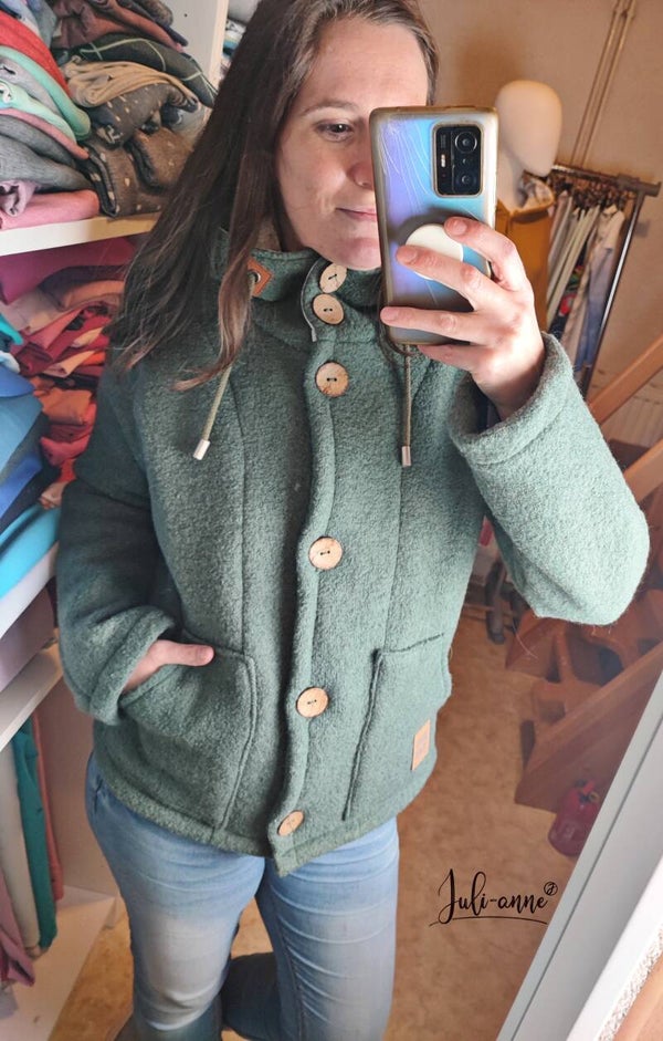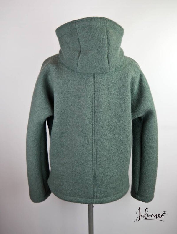 Die Ärmel sind überschnitten, dass heißt, sie sind direkt mit dem Vorteil verbunden und bestehen aus einem Stoffstück. Die Jacke ist einlagig. Nur die Kapuze ist mit einem Jersey gefüttert und die Knopfleiste hat einen Beleg aus Walk.