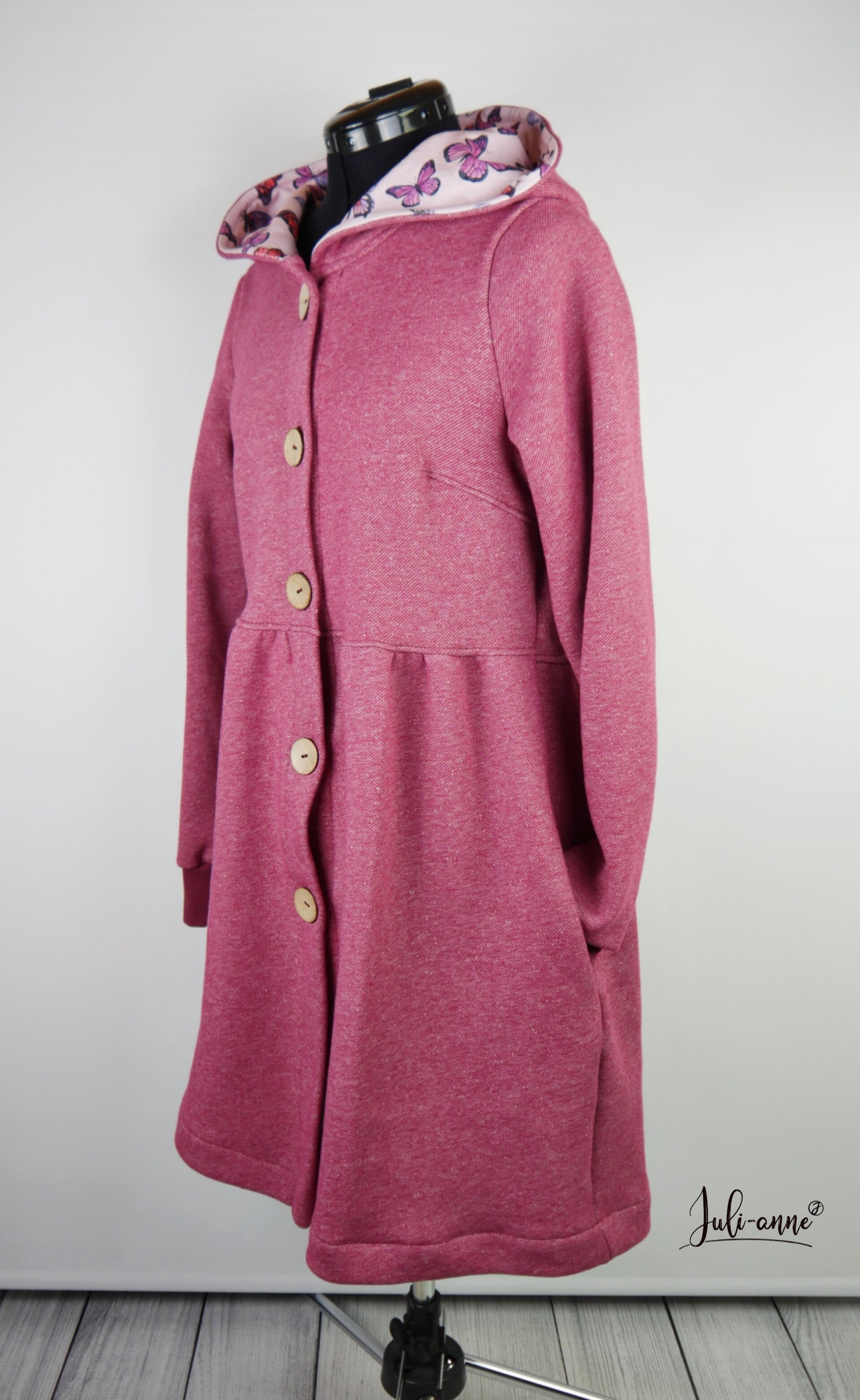 Der Mantel ist einlagig, nur die Kapuze ist mit Jersey gefüttert.