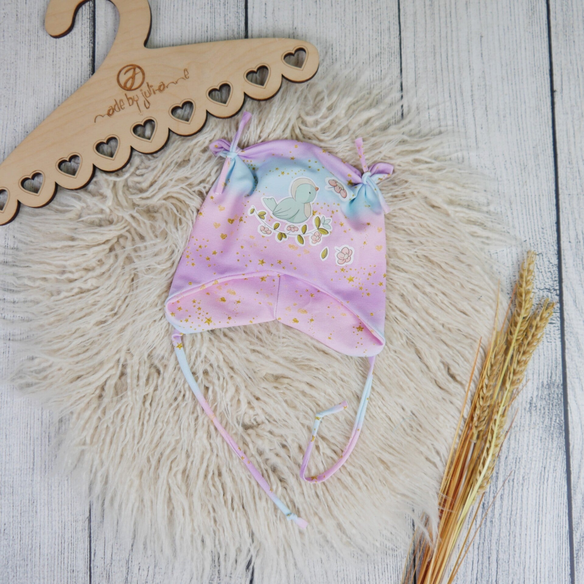 Die Mütze ist 2 lagig aus Jersey und für die Übergangszeit geeignet. Das Vögelchen ist ein Bügelbild.