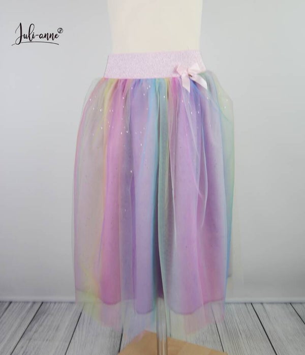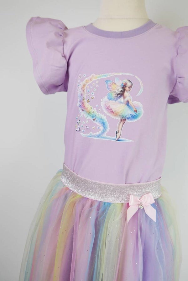 Kombi aus Cutie Shirt und halblangen Tüll Rock mit glitzernden Regenbogen-Tüll.