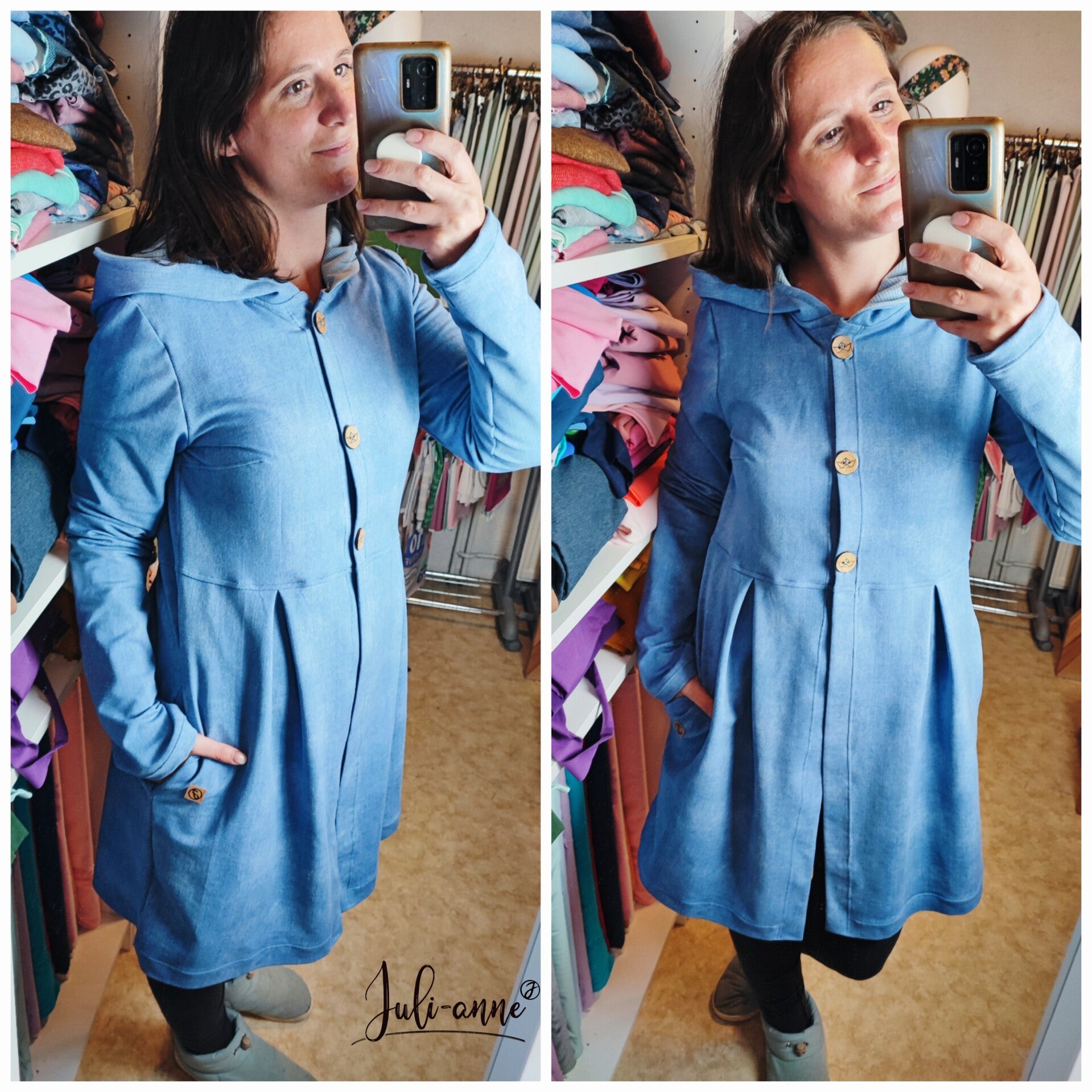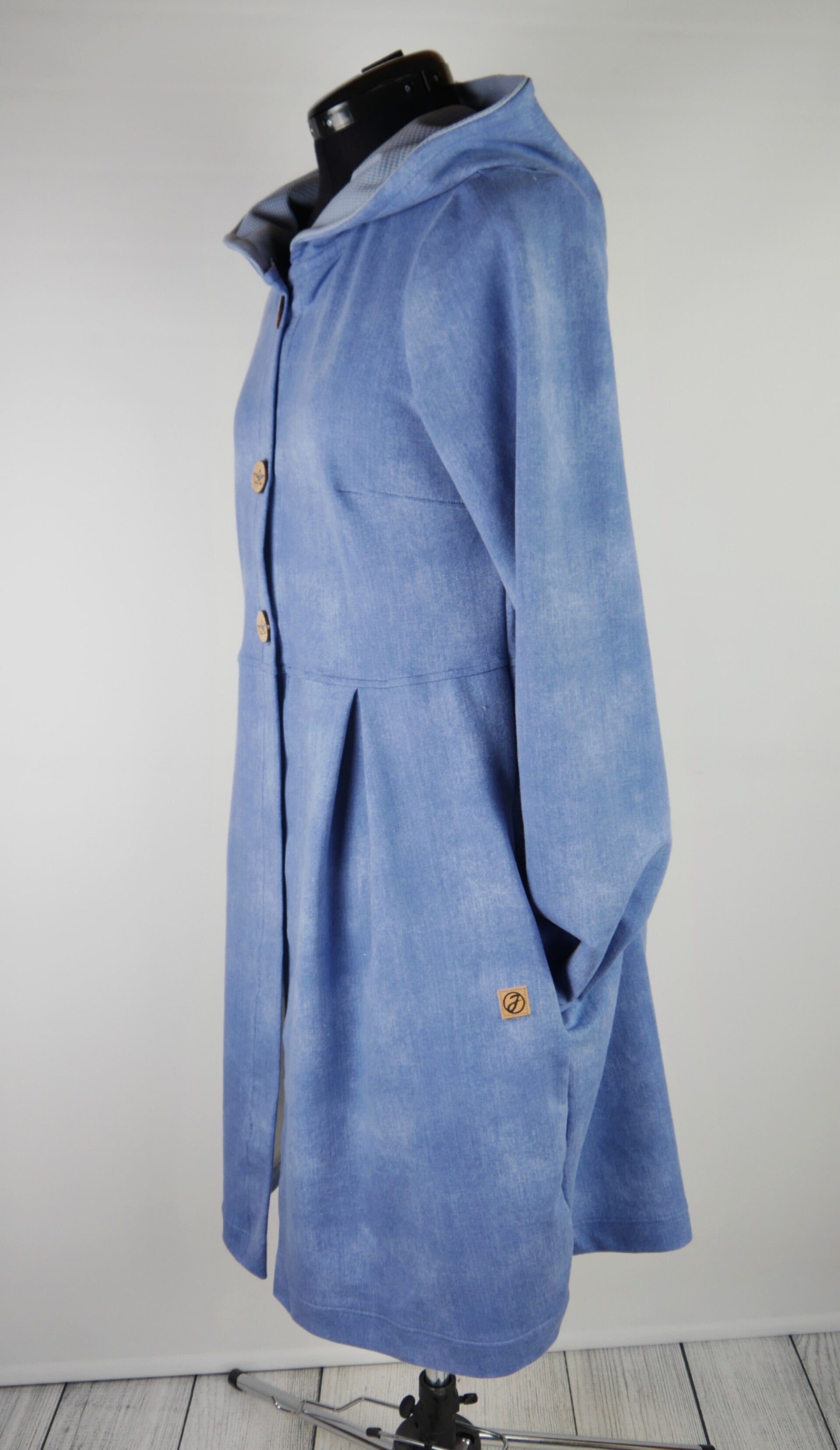 Hier erhält ihr den verspielten Mantel Jumi aus einem leichten Sommersweat in Jeansoptik.
