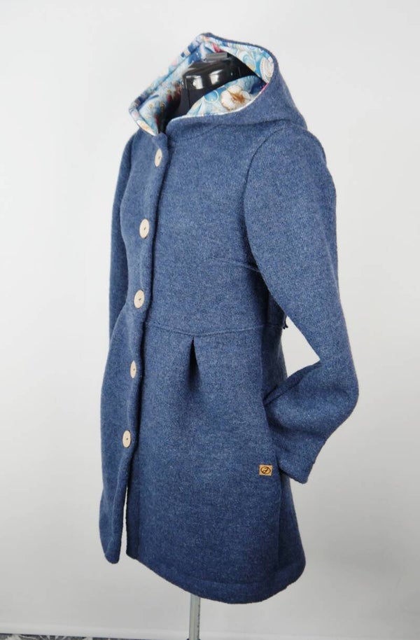 Der Mantel ist einlagig genäht, nur die Kapuze ist mit Jersey gefüttert. Das erleichtert die Pflege und erhält die natürlichen Eigenschaften von Wollwalk.