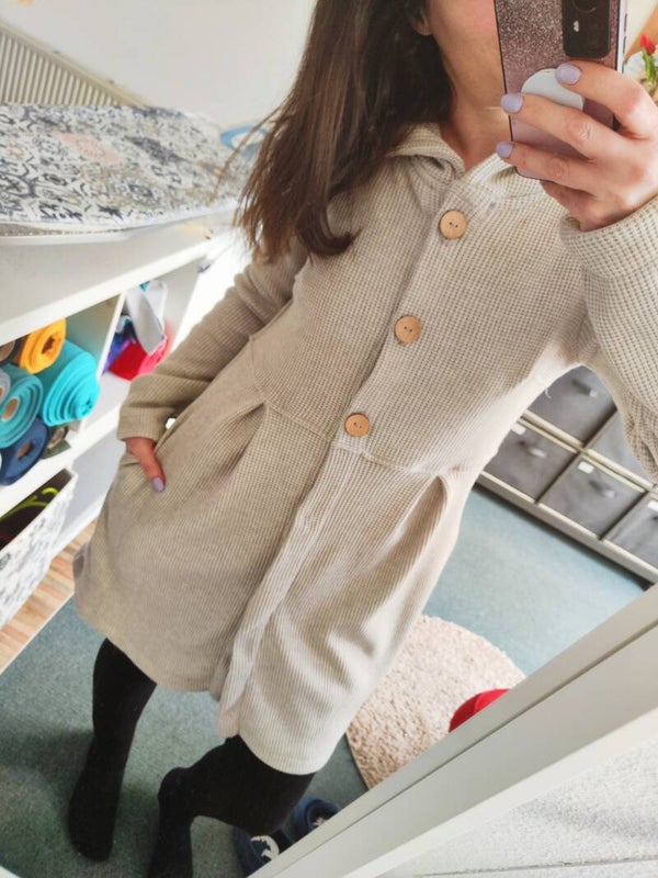 Der Mantel ist für eine durchschnittliche Körpergröße von 1,68 m ausgelegt und reicht etwa bis zur Mitte des Oberschenkels. Falls Du besonders groß oder klein bist, melde Dich gerne – ich passe den Mantel individuell für Dich an!