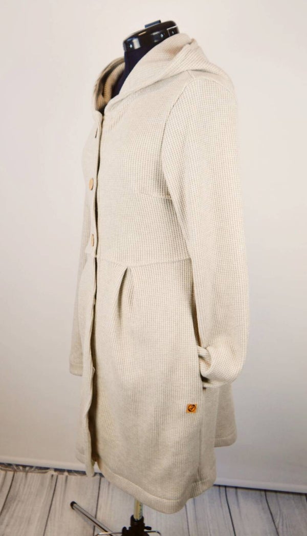 Hier siehst Du den Mantel in der Farbe Hellbeige. Bitte beachte, dass dieser Stoff nicht dauerhaft im Sortiment ist – es gilt also: nur solange der Vorrat reicht!
