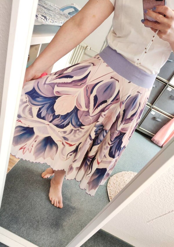 Dieser wunderschöne Tellerrock ist ein Must-Have für alle, die Leichtigkeit und Eleganz lieben. Gefertigt aus einem hochwertigen, leichten Jersey, bietet er ein angenehmes Tragegefühl und schwingt traumhaft bei jeder Bewegung. Das Besondere: Ein zauberhafter Blumenpanel-Stoff trifft auf einen dekorativen Wave-Saum, der dem Rock eine verspielte und feminine Note verleiht.
