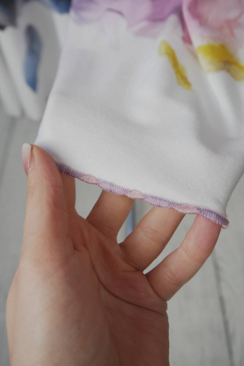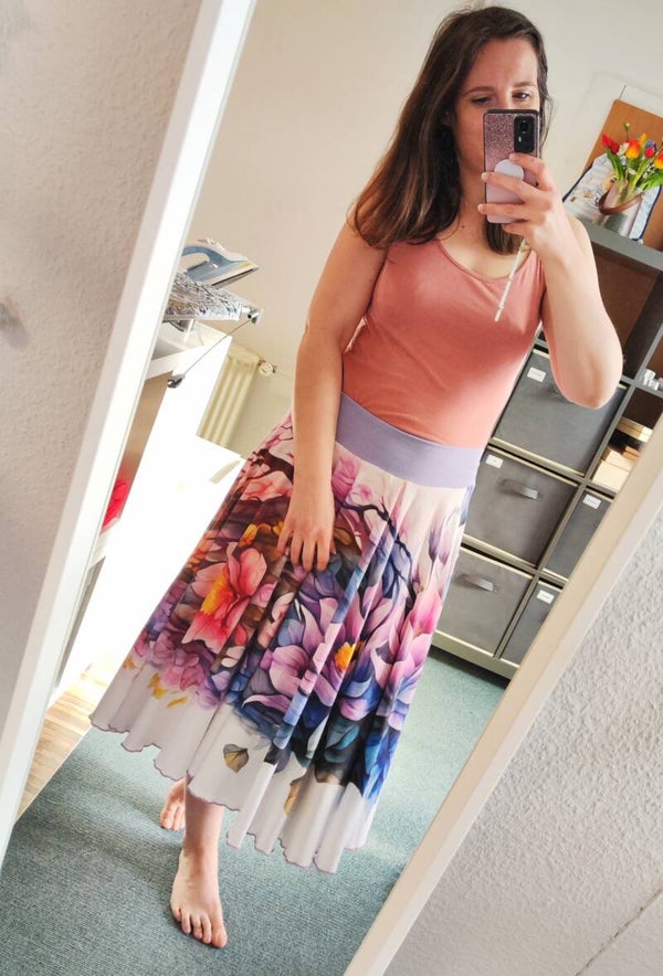 Dieser wunderschöne Tellerrock ist ein Must-Have für alle, die Leichtigkeit und Eleganz lieben. Gefertigt aus einem hochwertigen, leichten Jersey, bietet er ein angenehmes Tragegefühl und schwingt traumhaft bei jeder Bewegung. Das Besondere: Ein zauberhafter Blumenpanel-Stoff trifft auf einen dekorativen Wave-Saum, der dem Rock eine verspielte und feminine Note verleiht.