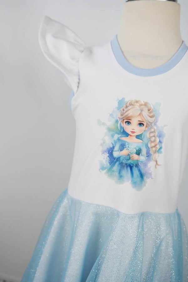 Drehkleid - Eisprinzessin blau weiß mit Glitzer Tüll