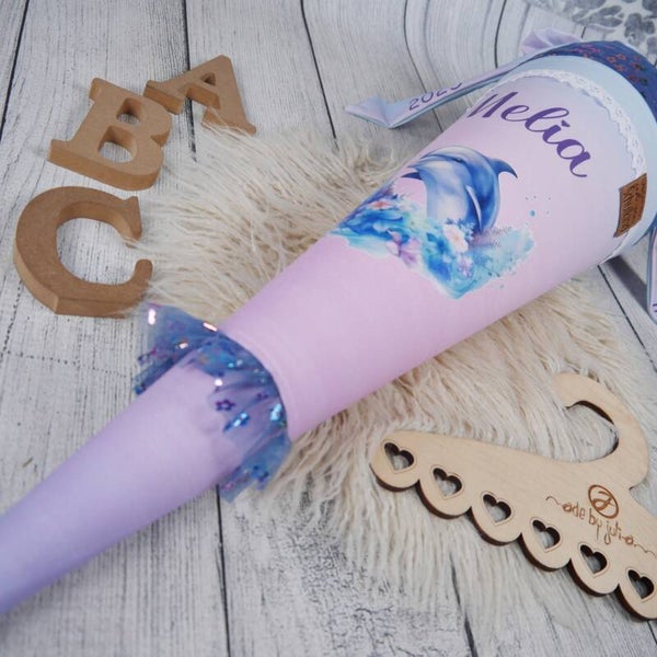 Schultüte Delfin mit Metallic Blümchen Tüll 70cm / 85cm / Geschwister