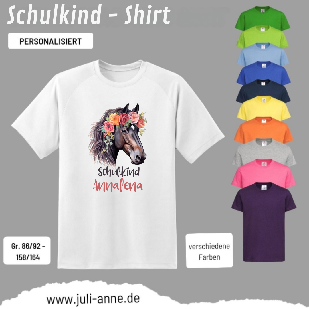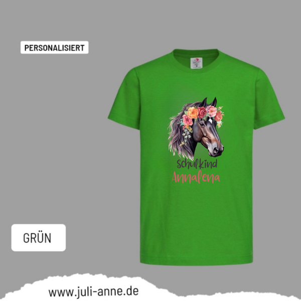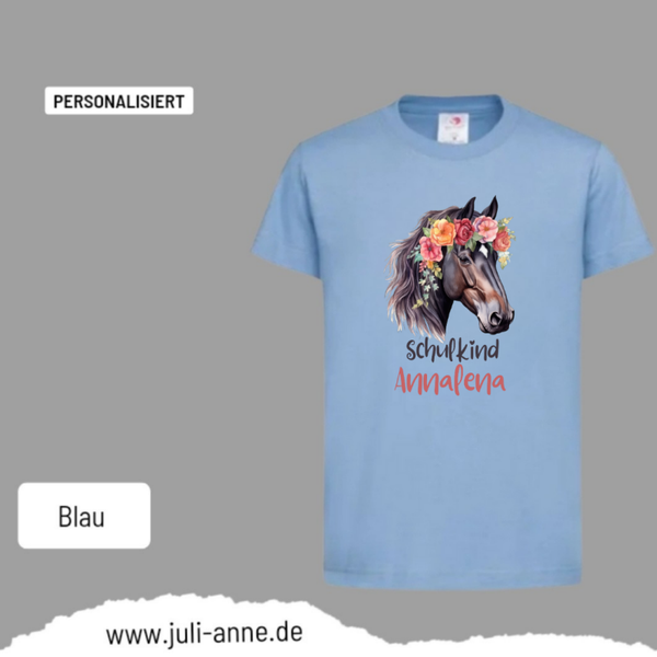 Kinder Basic-Shirt SCHULKIND personalisiert Zahl Name AQUARELL PFERD 2