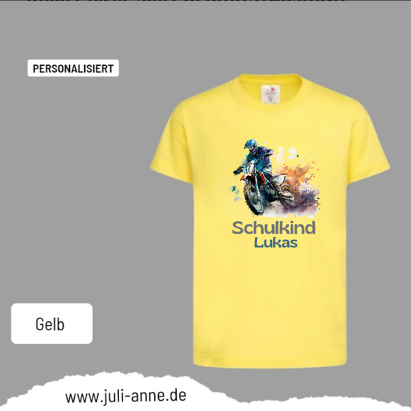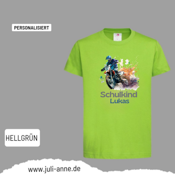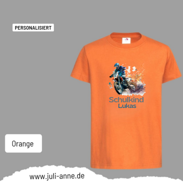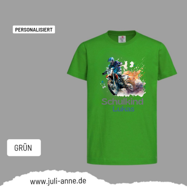 Kinder Basic-Shirt SCHULKIND personalisiert Zahl Name MOTOCROSS BLAU