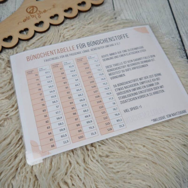 Falls du keinen Drucker zur Hand hast, kannst du dir hier auch die fertige laminierte Tabelle bestellen: Bündchen Umrechnungstabelle