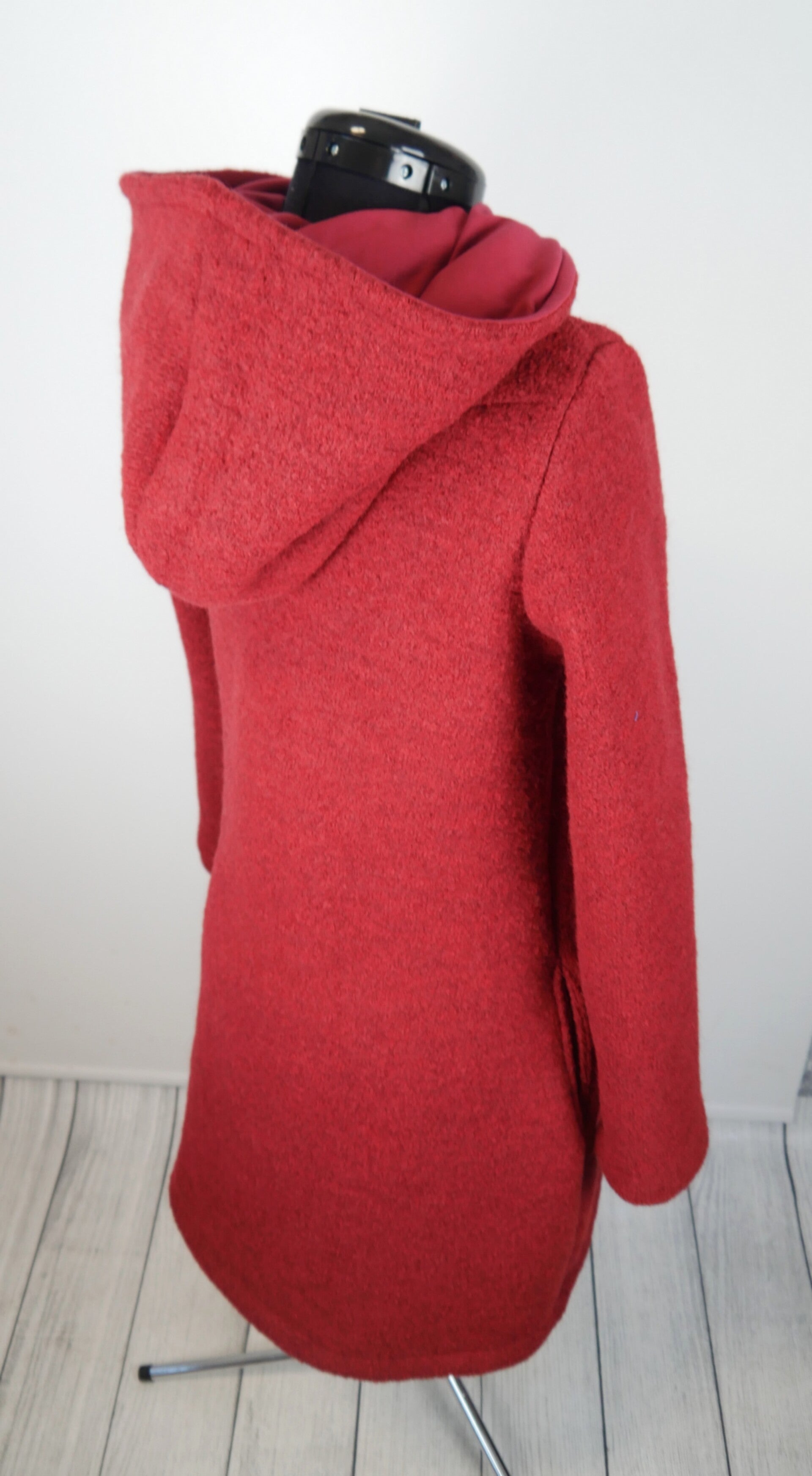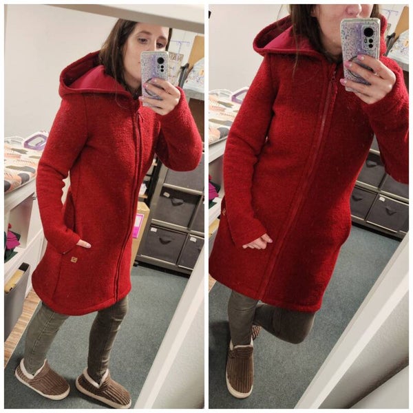 Der Mantel ist einlagig genäht, nur die Kapuze ist mit Jersey gefüttert. Das erleichtert die Pflege und erhält die natürlichen Eigenschaften von Wollwalk.