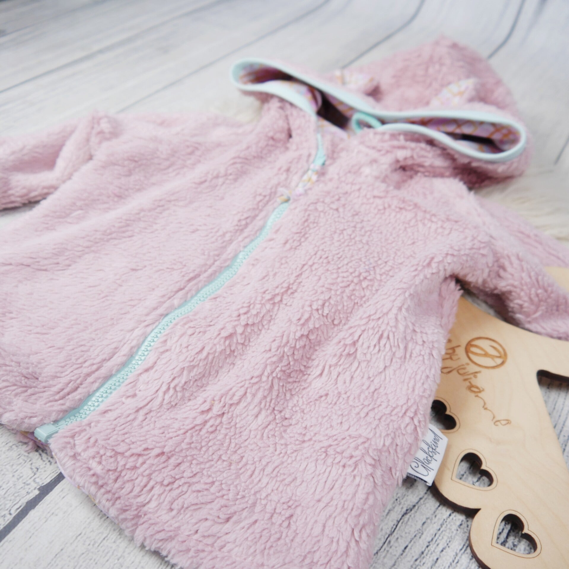 Diese Jacke besteht Außen aus einem wunderschönen weichen Kuschelteddy und ist mit einem Jersey gefüttert. Sie eignet sich gut für die Übergangszeit und kühle Sommertage.