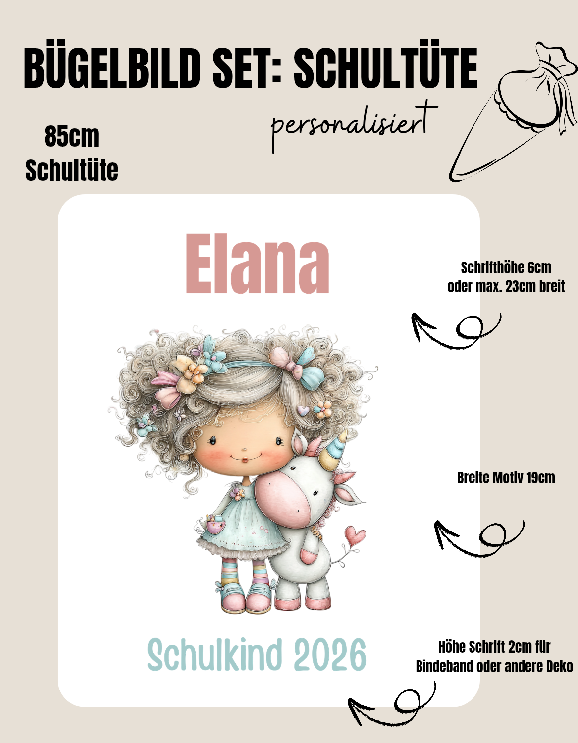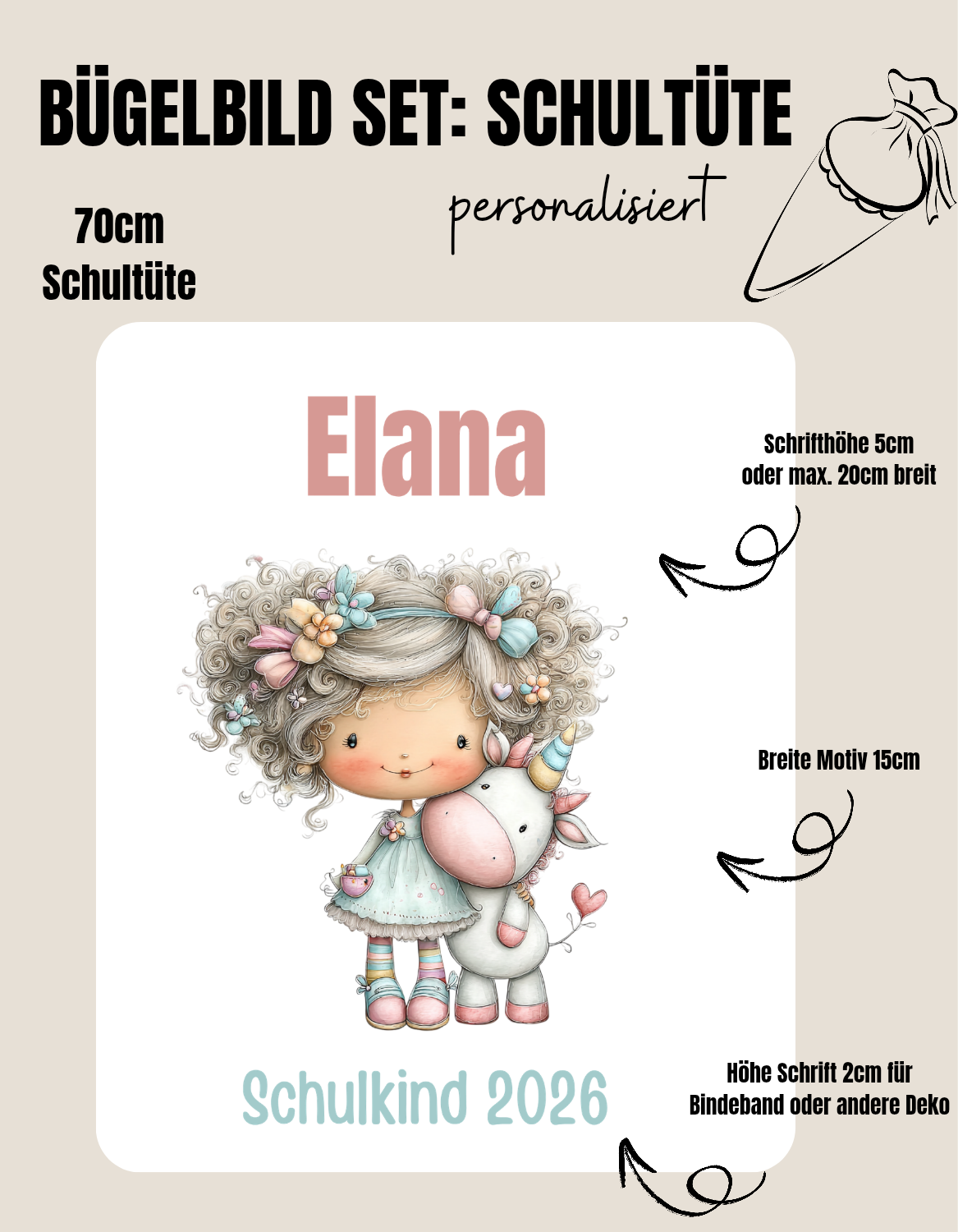 Dieses Set ist nicht nur PERSONALISIERT mit Wunschnamen bestellbar sondern von der Größe perfekt für Schultüten abgestimmt. Hierbei biete ich das Set sogar jeweils für Schultüten mit 70cm und 85cm Höhe an.