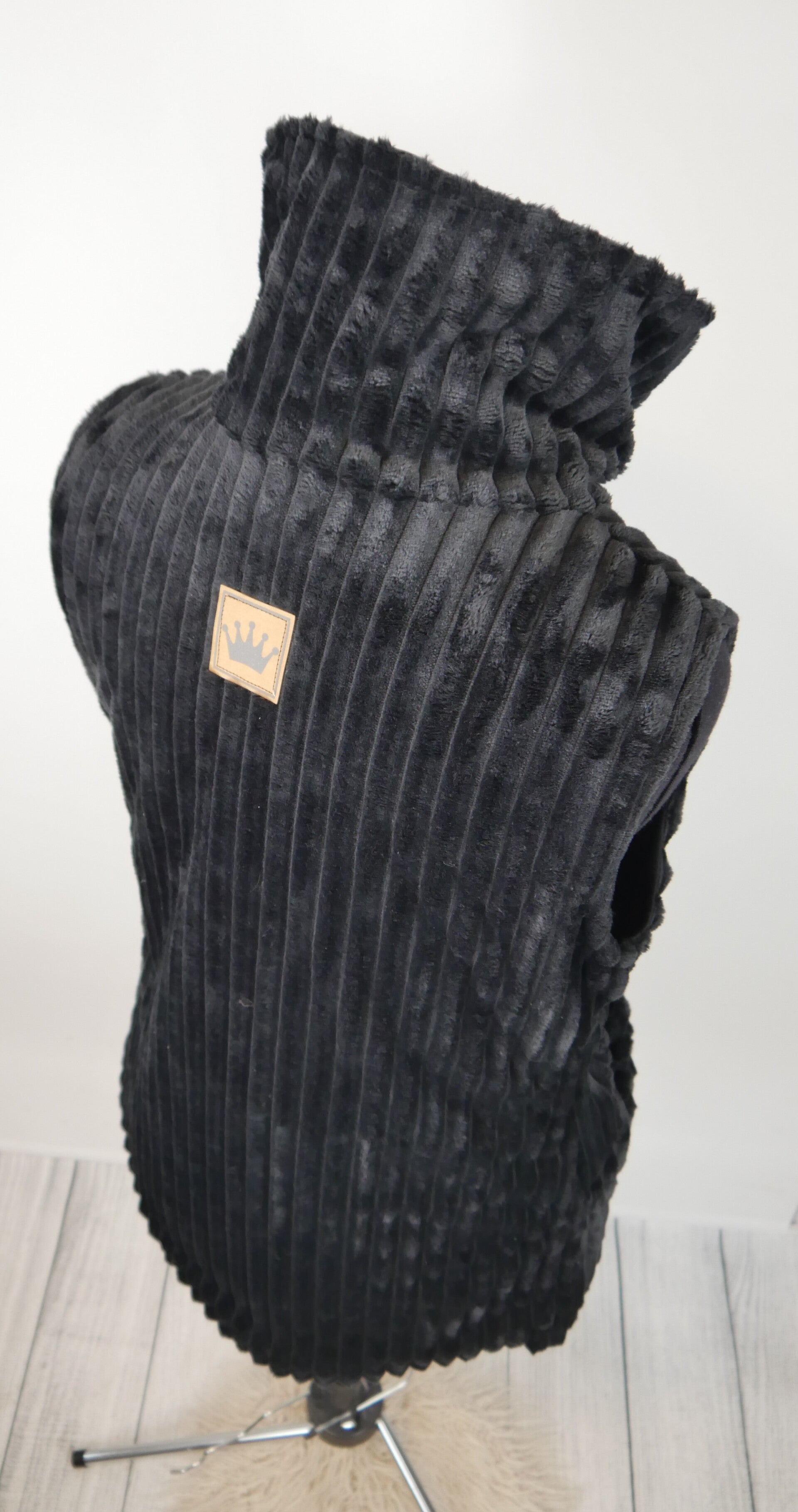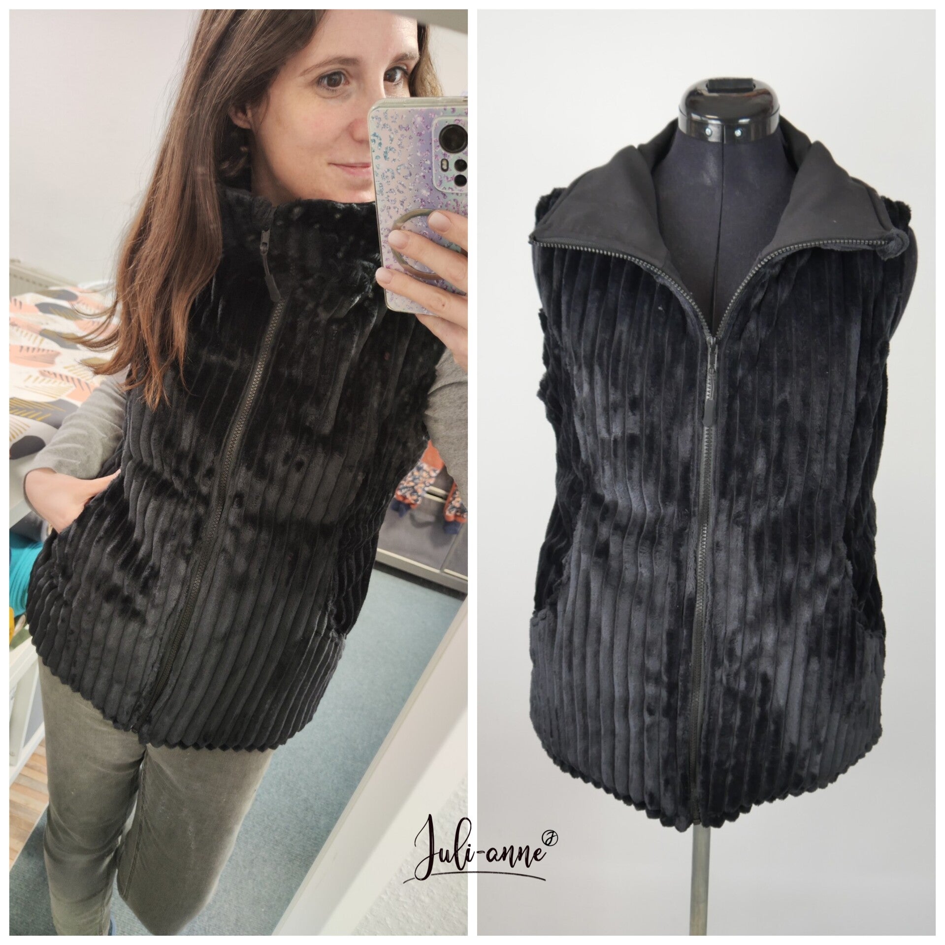 Sie ist zweilagig genäht Außen ist die Weste aus einem wunderbar kuscheligen Fleecestoff in Cordoptik. Innen wird ein Sommersweat verarbeitet.