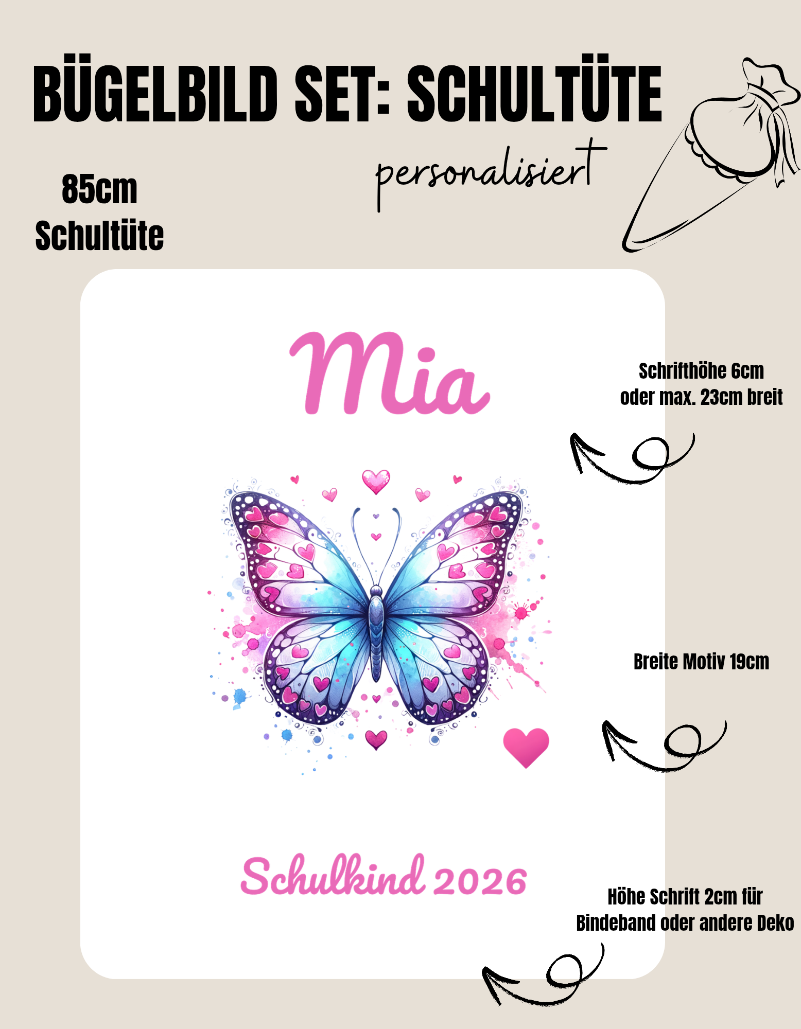 Das Set ist mit Wunschnamen personalisierbar und der Schulkindtext wird immer auf das aktuelle Jahr genadert. Die einzelnen Elemente sind in der Größe optimal auf Schultüten abgestimmt. Du kannst zwischen Varianten für 70 cm oder 85 cm hohe Schultüten wählen.
