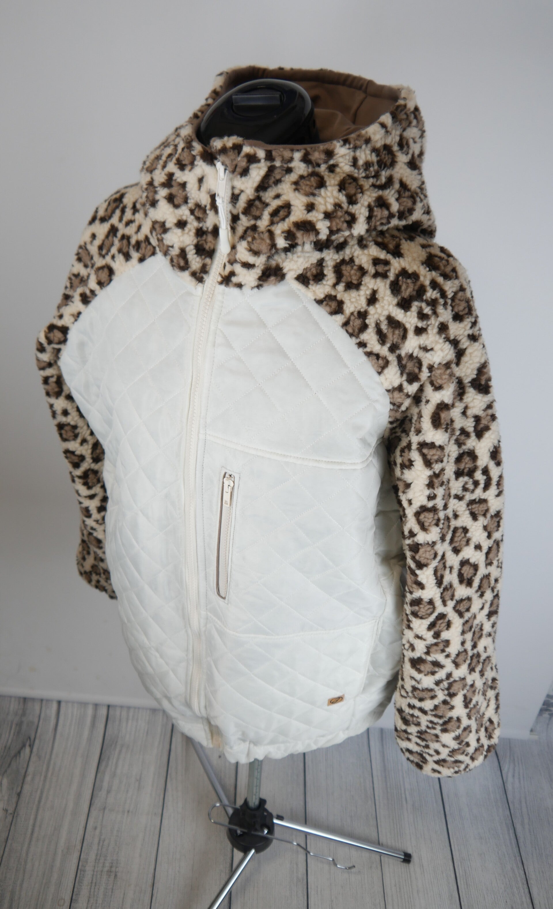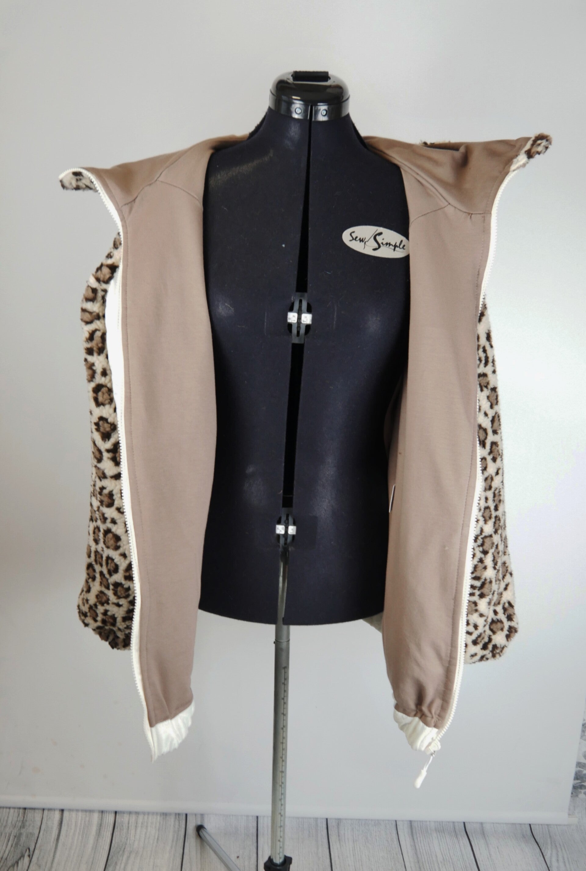 Diese Jacke nähe ich in einer tollen Kombination aus kuscheligen und trendigen Leo Teddy Stoff und einen Jacken Steppstoff. Innen ist sie mit leichtem Sommersweat gefüttert.
