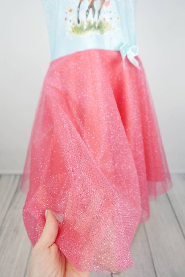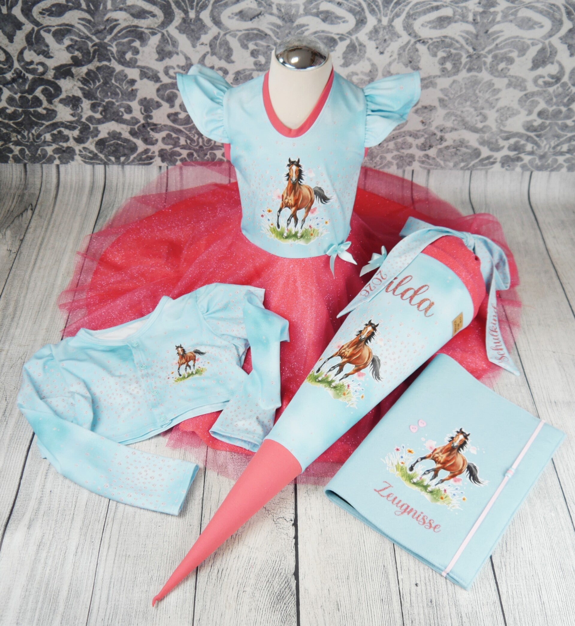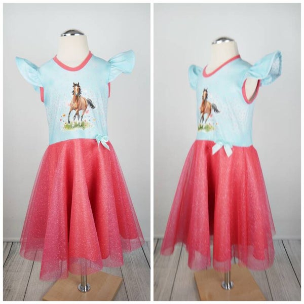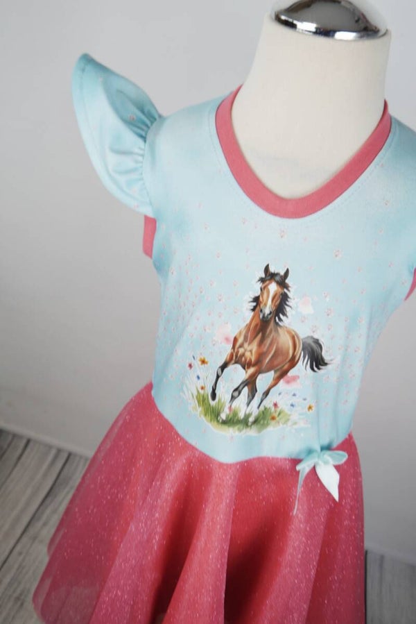 Drehkleid - Pferd Hellblau Koralle mit Glitzer Tüll