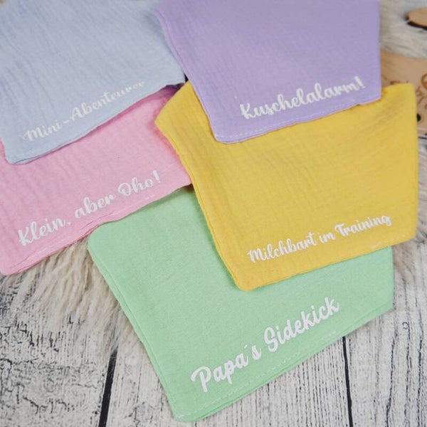 Bunte Musselin Halstücher mit Sprüchen oder Wunschtext (Sabberlatz)