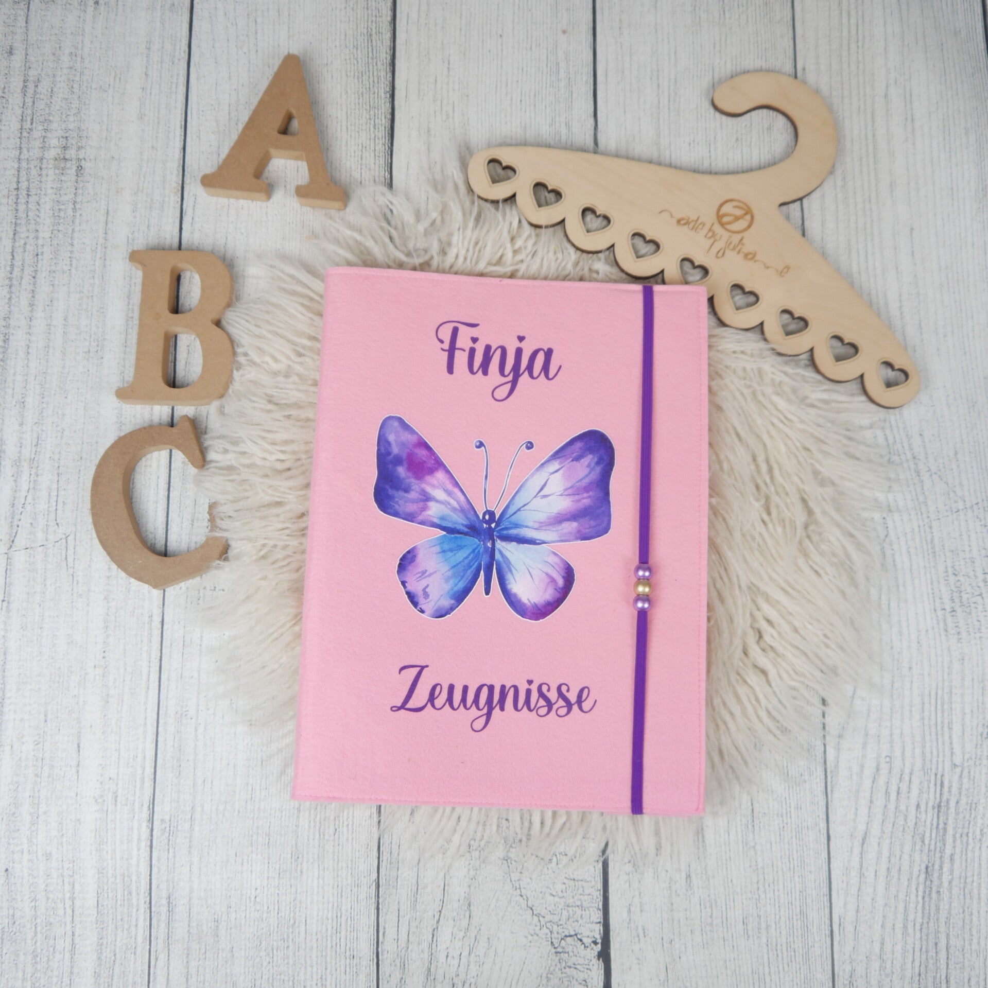 Diese personalisierte Zeugnismappe wird aus Filz genäht und bedruckt.