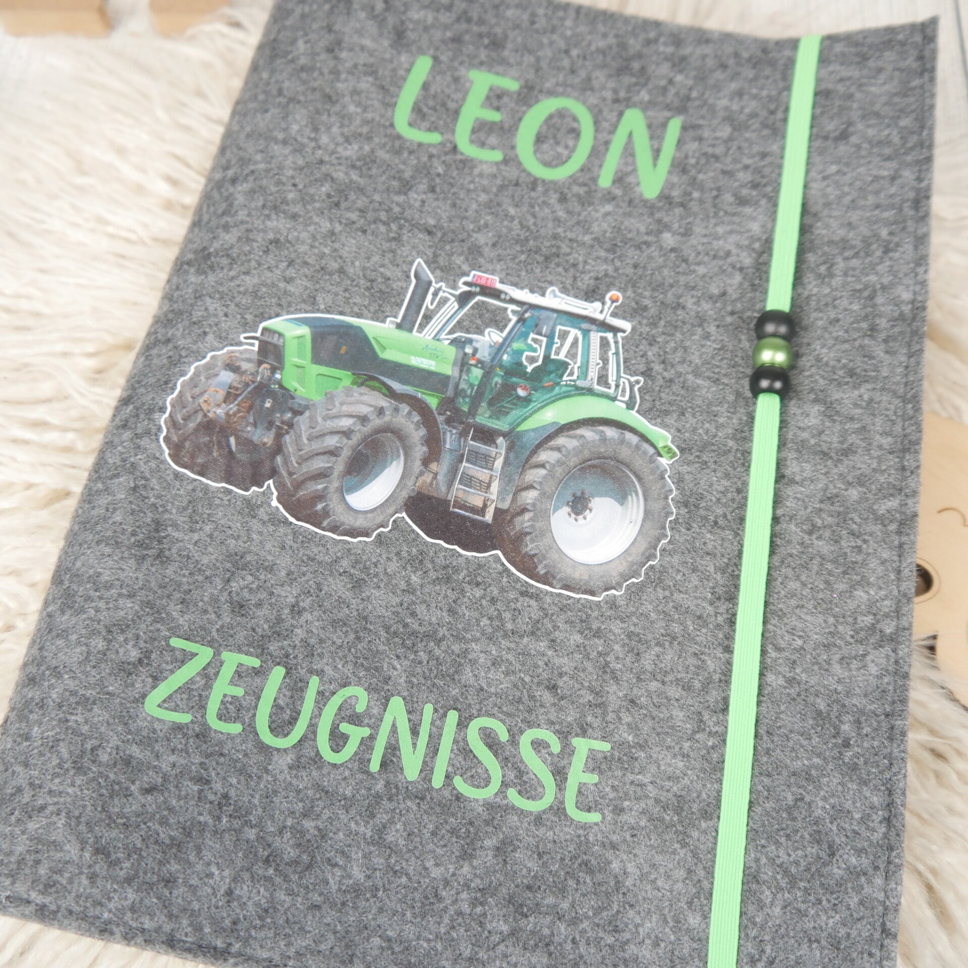 Diese personalisierte Zeugnismappe wird aus Filz genäht und bedruckt.
