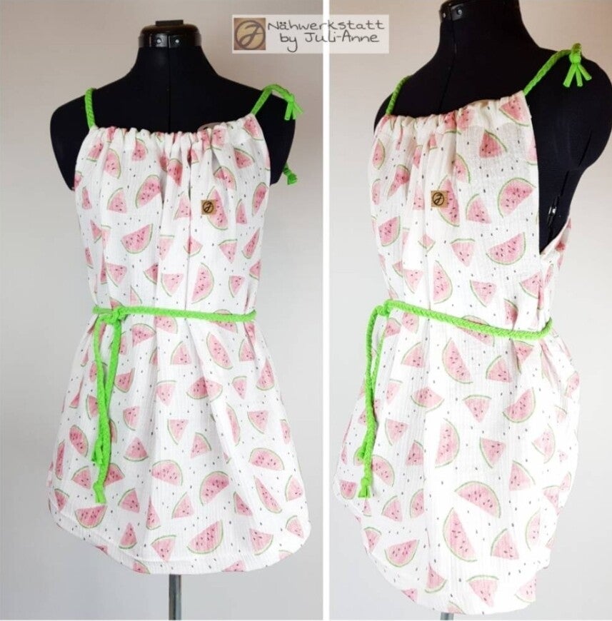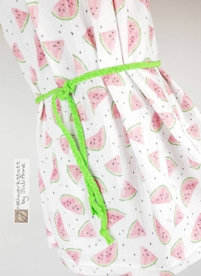 Luftiges und locker sitzendes Hängerchen aus Musselin. Die Träger werden an einer Seite gebunde - Ihr könnt das Hängerchen damit anpassen und den Ausschnitt nach Belieben einstellen. Passend dazu gibt es einen geflochtenen Gürtel aus Jersey. Dieser ist elastisch und besonders angenehm zu tragen. Er rafft das Top vorteilhaft an der Taille, kann aber auch einfach weggelassen werden.