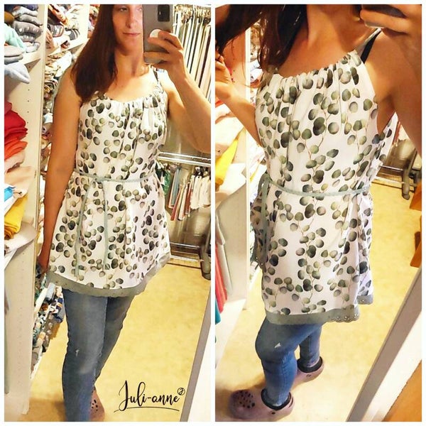 Luftiges und locker sitzendes Hängerchen aus Musselin. Die Träger werden an einer Seite gebunde - Ihr könnt das Hängerchen damit anpassen und den Ausschnitt nach Belieben einstellen. Passend dazu gibt es einen geflochtenen Gürtel aus Jersey. Dieser ist elastisch und besonders angenehm zu tragen. Er rafft das Top vorteilhaft an der Taille, kann aber auch einfach weggelassen werden.