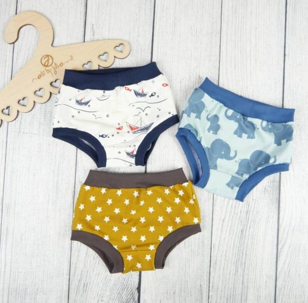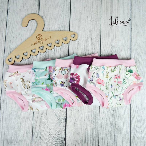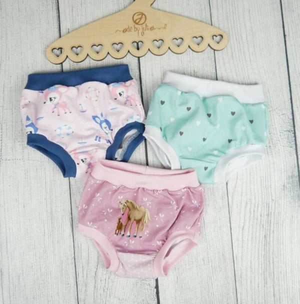 Die Schlüpfer nähe ich als 3er oder 5er Set im Überraschungsdesign. Hier könnt ihr wählen zwischen Mädchen, Junge oder Gemischt.