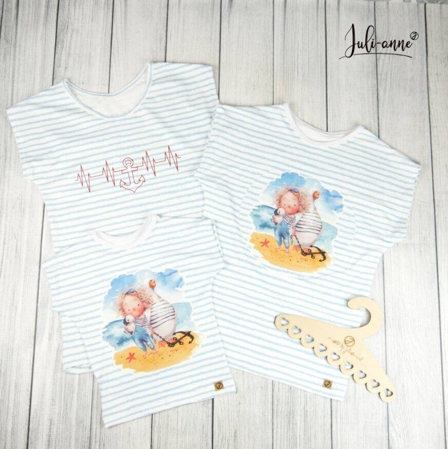 Dieser Schnitt ist ein lässiges Basicshirt. Es sitzt normal bis lässig wenn ihr es in eurer gewohnten Konfektionsgröße bestellt, Eine Größe größer und ihr habt ein cooles Overzize-Shirt. Dieses Shirt ist aus einem butterweichen Streifen-Jersey genäht. Die Anker-Herzkurve ist ein Bügelbild, dass ich professionell und haltbar mit der Transferpresse aufbringe.