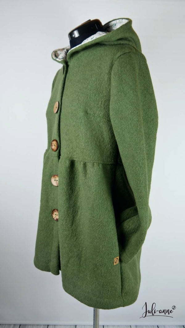 Der Mantel ist einlagig genäht, nur die Kapuze ist mit Jersey gefüttert. Das erleichtert die Pflege und erhält die natürlichen Eigenschaften von Wollwalk.