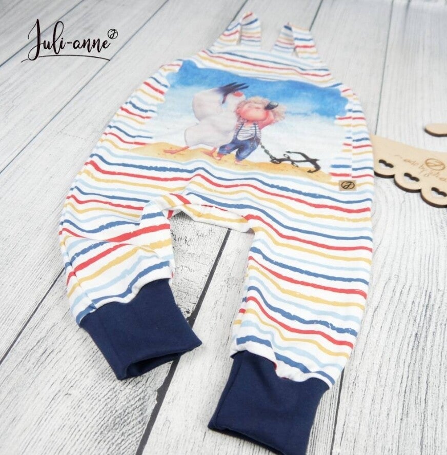 Coole maritime Latzhose mit verstellbaren Trägern. Dank Doppelgröße wächst diese Hose lange mit. Der Schnitt ist eine tolle Alternative zum klassischen Strampler.