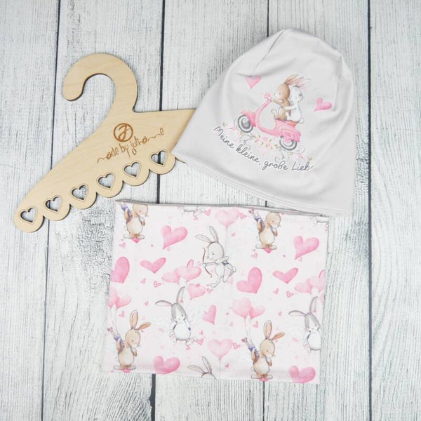Set: Beanie & Schlupfschal Hasen auf Motoroller