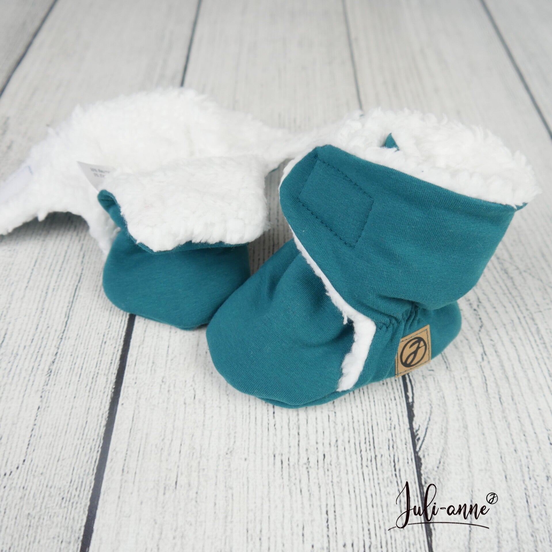 Die Stiefel aus Jersey und kuscheligen Baumwollteddy sind ein toller Alltags-Begleiter. Ob im Kinderwagen, Trage, Autositz oder krabbelnd Die Welt erkunden - dein Kind wird immer warme Füße haben =) Zum Laufen lernen werden sie nicht empfohlen.