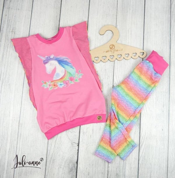 Zusätzlich fertige ich euch gern eine passende lange Leggings aus den Regenbogenstreifen (siehe Bilder).