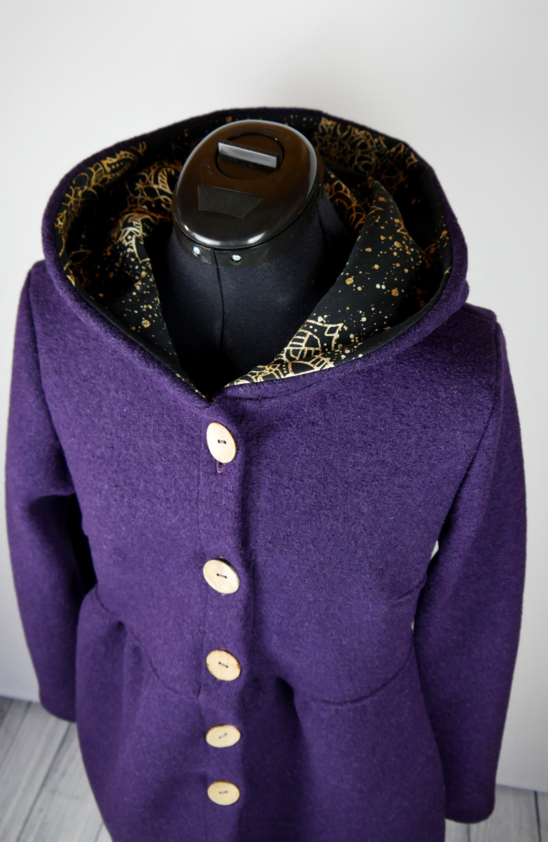 Der Mantel ist einlagig genäht, nur die Kapuze ist mit Jersey gefüttert. Das erleichtert die Pflege und erhält die natürlichen Eigenschaften von Wollwalk.
