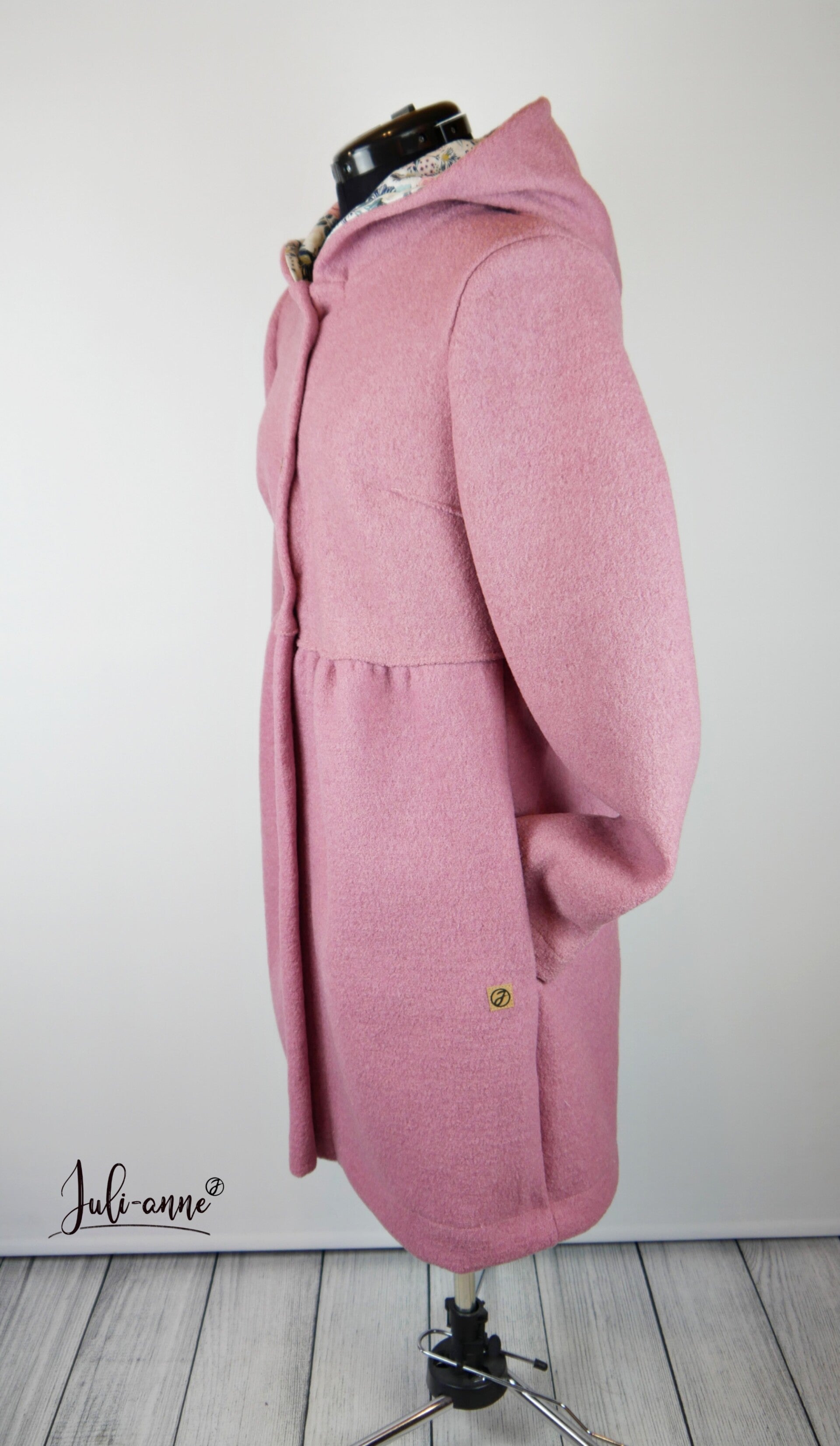 Der Mantel ist einlagig genäht, nur die Kapuze ist mit Jersey gefüttert. Das erleichtert die Pflege und erhält die natürlichen Eigenschaften von Wollwalk.